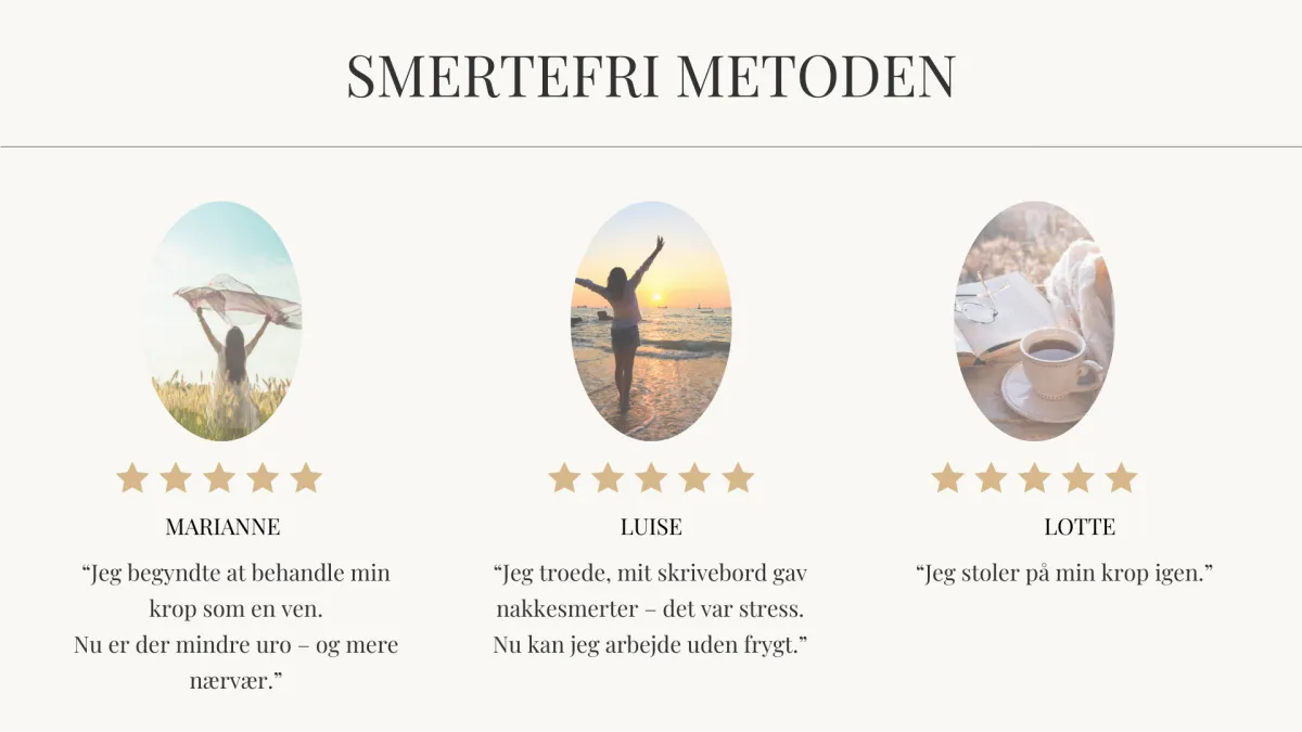 Du lærer at bruge de samme principper gennem Smertefri Metoden – i dit eget tempo og med støtte undervejs.